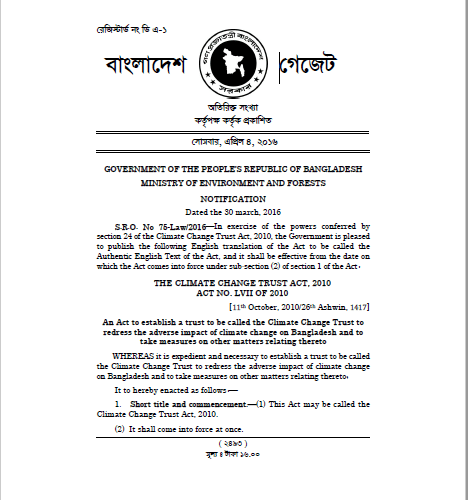 This is intended as the government’s quick-start domestic response to climate change adaptation activities, which are planned through the BCCSAP. As such this Act is closely linked to the BCCSAP. It stipulates allocating an initial budget of USD100m per year for three years between 2009 and 2011. It stipulates that 66% of its budget will be spent on the implementation of projects/programmes prioritised in the BCCSAP. The remaining 34% will be maintained as a deposit for emergencies. Interest accrued on the deposit will be spent on project implementation. Funds from the BCCTF can be used to finance public sector and non-government projects. It is not mandatory to spend the total grant within a given financial year.